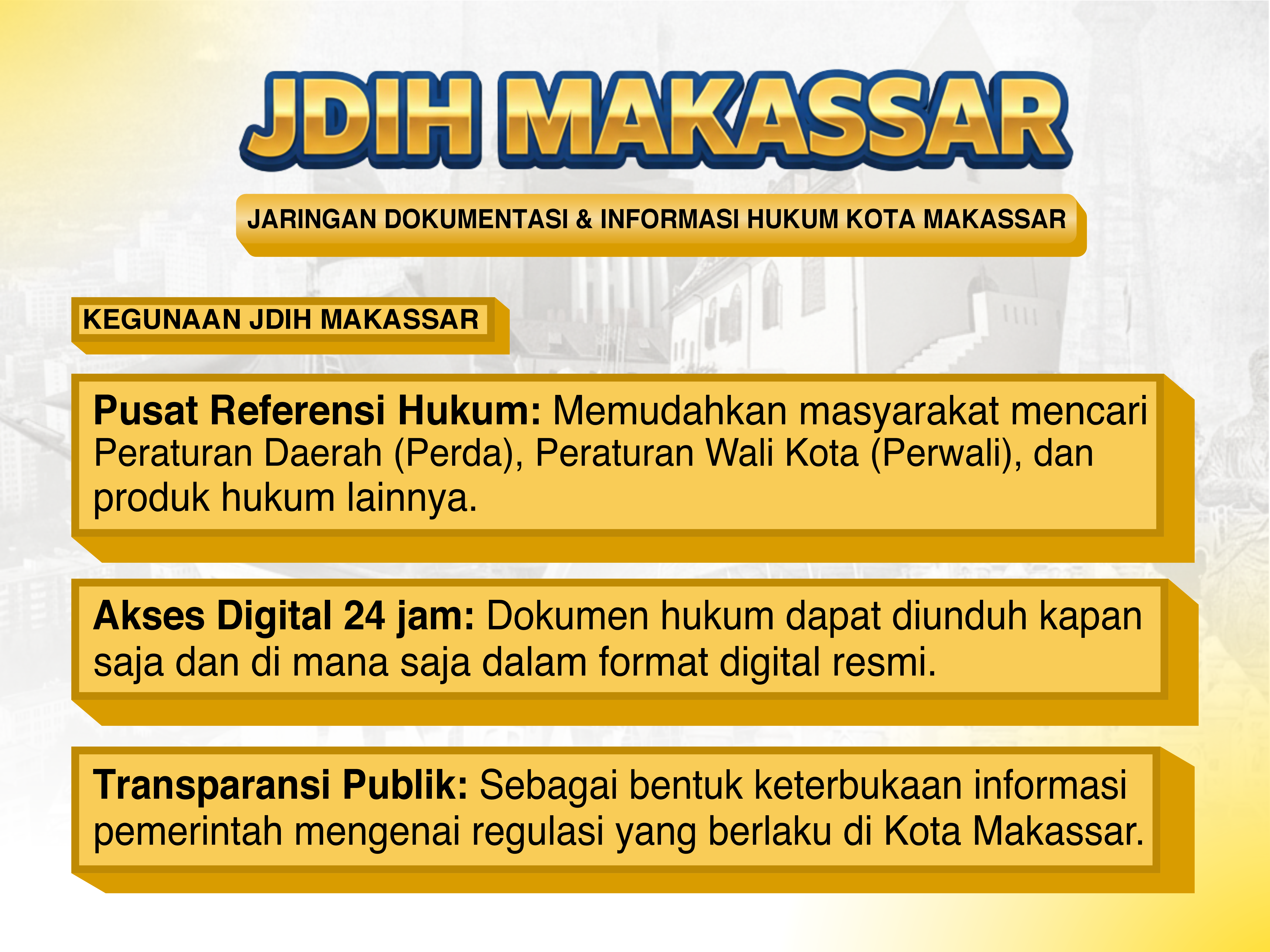 Dalam rangka menciptakan lingkungan yang aman dan nyaman bagi seluruh warga kota melalui penegakan hukum dan peningkatan kualitas hidup, JDIH hadir sebagai layanan informasi hukum yang lengkap, akurat, mudah, dan cepat. Pengelolaan JDIH merupakan kewajiban pemerintah daerah demi mewujudkan tata kelola pemerintahan yang transparan, akuntabel, dan berintegritas.