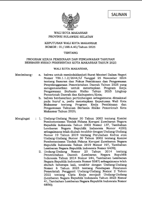 Keputusan Walikota Makassar Nomor 1/188.45/tahun 2025 Tentang Program Kerja Pembinaan Dan Pengawasan Tahunan Berbasis Risiko Pemerintah Kota Makassar Tahun 2025