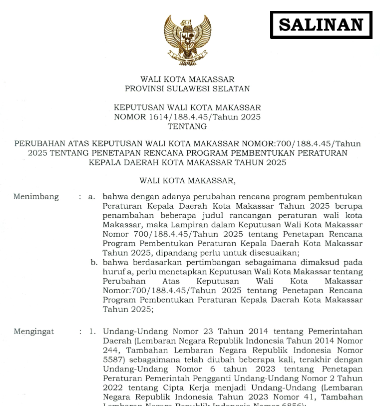 Keputusan Walikota Makassar Nomor 1614 Tahun 2025 Tentang Perubahan Atas Keputusan Wali Kota Makassar Nomor:700/ 188.4.45/tahun 2025 Tentang Penetapan Rencana Program Pembentukan Peraturan Kepala Daerah Kota Makassar Tahun 2025