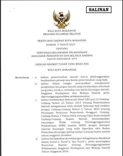 Peraturan Daerah Kota Makassar Nomor 2 Tahun 2025 Tentang Pertanggungjawaban Pelaksanaan Anggaran Pendapatan Dan Belanja Daerah Tahun Anggaran 2024