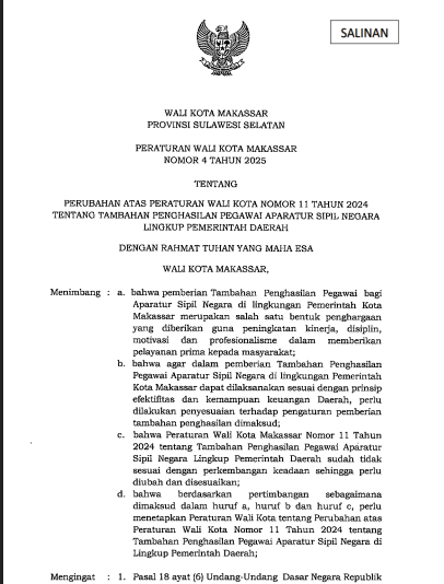 Peraturan Walikota Makassar Nomor 4 Tahun 2025 Tentang Perubahan Atas Peraturan Wali Kota Nomor 11 Tahun 2024 Tentang Tambahan Penghasilan Pegawai Aparatur Sipil Negara Lingkup Pemerintah Daerah
