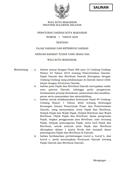 Peraturan Daerah Kota Makassar Nomor 1 Tahun 2024 Tentang Pajak Dan Retribusi Daerah