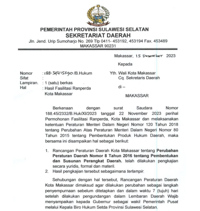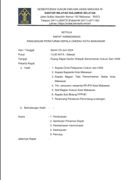Harmonisasi Rancangan Peraturan Daerah Kota Makassar Tentang Perubahan Peraturan Daerah Nomor 8 Tahun 2016 Tentang Pembentukan Dan Susunan Perangkat .............