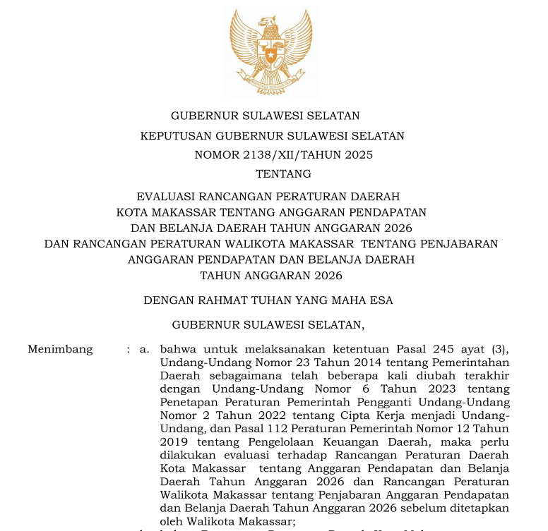 Kajian Produk Hukum Makassar Nomor 2138 Tahun 2025 Tentang Evaluasi Rancangan Peraturan Daerah Kota Makassar Tentang Anggaran Pendapatan Dan Belanja .............
