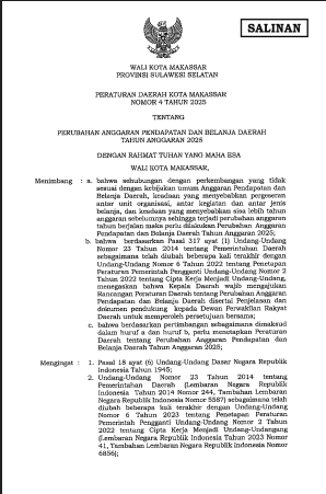 Peraturan Daerah Kota Makassar Nomor 4 Tahun 2025 Tentang Perubahan Anggaran Pendapatan Dan Belanja Daerah Tahun Anggaran 2025