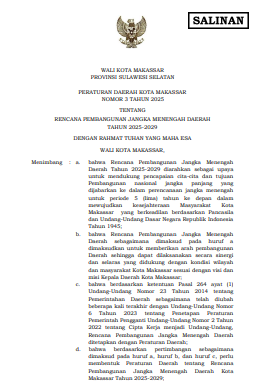 Peraturan Daerah Kota Makassar Nomor 3 Tahun 2025 Tentang Rencana Pembangunan Jangka Menengah Daerah Tahun 2025-2029