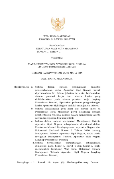 Rancangan Peraturan Walikota Makassar Nomor 1 Tahun 2026 Tentang Manajemen Talenta Aparatur Sipil Negara Lingkup Pemerintah Daerah