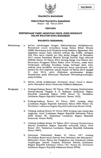 Peraturan Walikota Makassar Nomor 49 Tahun 2014 Tentang Penyesuaian Tarif Angkutan Umum Jenis Mikrolet Dalam Wilayah Kota Makassar