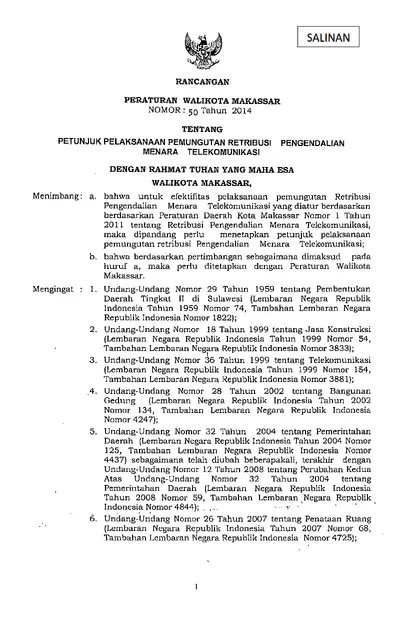 Peraturan Walikota Makassar Nomor 50 Tahun 2014 Tentang Petunjuk Pelaksanaan Pemungutan Retribusi Pengendalian Menara Telekomunikasi