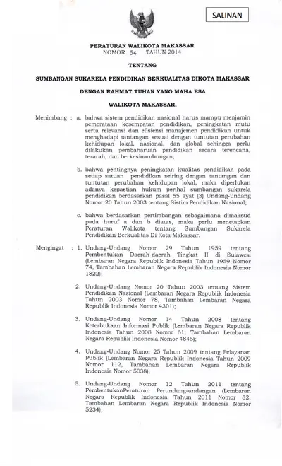 Peraturan Walikota Makassar Nomor 54 Tahun 2014 Tentang Sumbangan Sukarela Pendidikan Berkualitas Di Kota Makassar