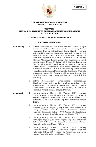 Peraturan Walikota Makassar Nomor 57 Tahun 2014 Tentang Sistem Dan Prosedur Pengelolaan Keuangan Daerah Kota Makassar
