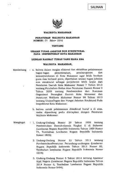 Peraturan Wali Kota Makassar Nomor 71 Tahun 2014 Tentang Uraian Tugas Jabatan Non Struktural Pada Inspektorat Kota Makassar
