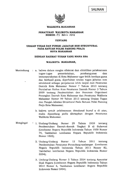 Peraturan Wali Kota Makassar Nomor 73 Tahun 2014 Tentang Uraian Tugas Dan Fungsi Jabatan Non Struktural Pada Satuan Polisi Pamong Praja Kota Makassar