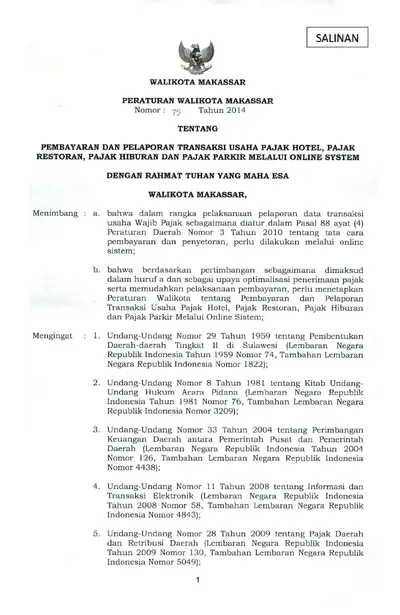 Peraturan Walikota Makassar Nomor 75 Tahun 2014 Tentang Pembayaran Dan Pelaporan Transaksi Usaha Pajak Hotel, Pajak Restoran, Pajak Hiburan Dan Pajak .............