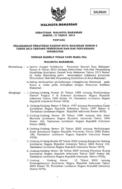 Peraturan Walikota Makassar Nomor 77 Tahun 2014 Tentang Pelaksanaan Peraturan Daerah Kota Makassar Nomor 6 Tahun 2013 Tentang Pemenuhan Hak-hak .............
