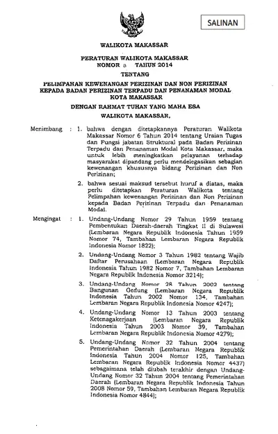 Peraturan Walikota Makassar Nomor 8 Tahun 2014 Tentang Pelimpahan Kewenangan Perizinan Dan Non Perizinan Kepada Badan Perizinan Terpadu Dan Penanaman .............