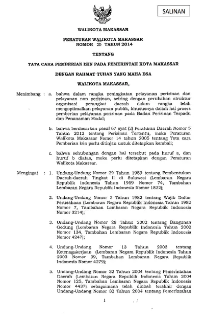Peraturan Walikota Makassar Nomor 20 Tahun 2014 Tentang Tata Cara Pemberian Izin Pada Pemerintah Kota Makassar