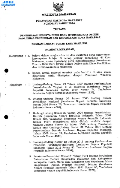Peraturan Walikota Makassar Nomor 22 Tahun 2014 Tentang Penerimaan Peserta Didik Baru (ppdb) Secara Online Pada Dinas Pendidikan Dan Kebudayaan Kota .............