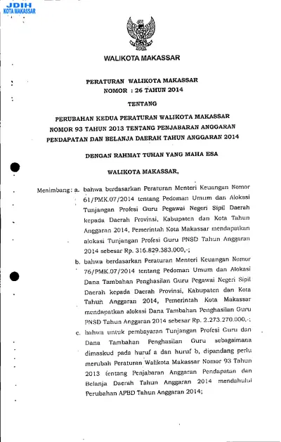 Peraturan Walikota Makassar Nomor 26 Tahun 2014 Tentang Perubahan Kedua Atas Peraturan Walikota Makassar Nomor 93 Tahun 2013 Tentang Penjabaran .............