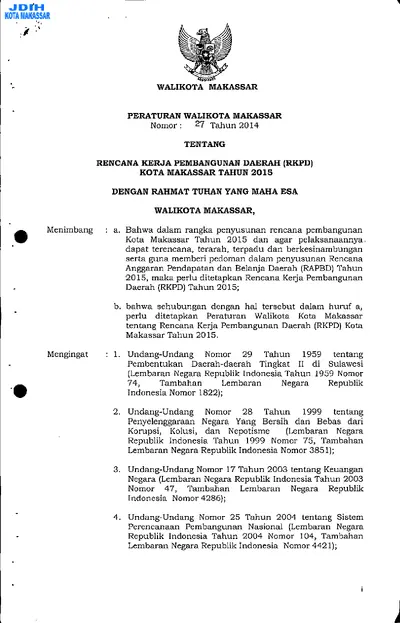 Peraturan Walikota Makassar Nomor 27 Tahun 2014 Tentang Rencana Kerja Pembangunan Daerah (RKPD) Kota Makassar Tahun 2015