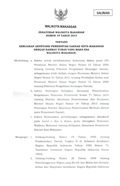 Peraturan Walikota Makassar Nomor 28 Tahun 2014 Tentang Kebijakan Akuntansi Pemerintah Daerah Kota Makassar