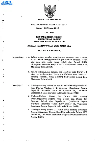 Peraturan Walikota Makassar Nomor 38 Tahun 2013 Tentang Rencana Kerja (RENJA) Sekretariat Korpri Kota Makassar Tahun 2014