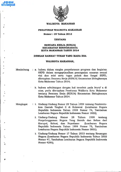 Peraturan Walikota Makassar Nomor 39 Tahun 2013 Tentang Rencana Kerja (RENJA) Kecamatan Biringkanaya Kota Makassar Tahun 2014