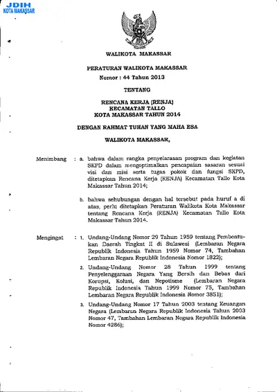 Peraturan Walikota Makassar Nomor 44 Tahun 2013 Tentang Rencana Kerja (RENJA) Kecamatan Tallo Kota Makassar Tahun 2014