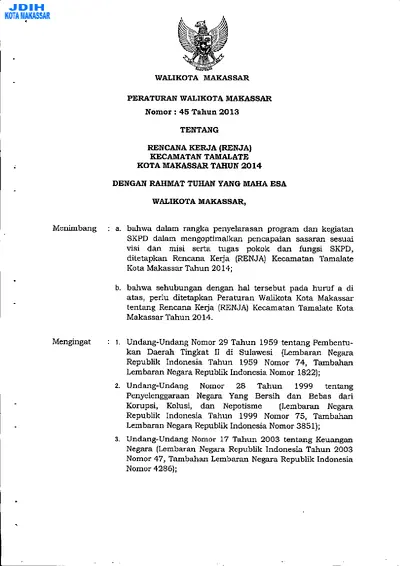 Peraturan Walikota Makassar Nomor 45 Tahun 2013 Tentang Rencana Kerja (RENJA) Kecamatan Tamalate Kota Makassar Tahun 2014