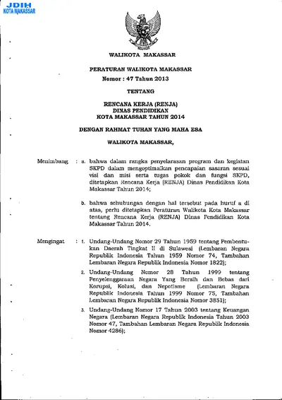 Peraturan Walikota Makassar Nomor 47 Tahun 2013 Tentang Rencana Kerja (RENJA) Dinas Pendidikan Kota Makassar Tahun 2014