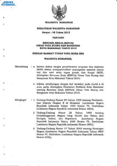 Peraturan Walikota Makassar Nomor 48 Tahun 2013 Tentang Rencana Kerja (RENJA) Dinas Tata Ruang Dan Bangunan Kota Makassar Tahun 2014