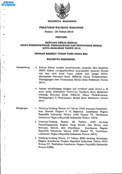 Peraturan Walikota Makassar Nomor 26 Tahun 2013 Tentang Rencana Kerja (RENJA) Dinas Perindustrian, Perdagangan Dan Penanaman Modal Kota Makassar .............