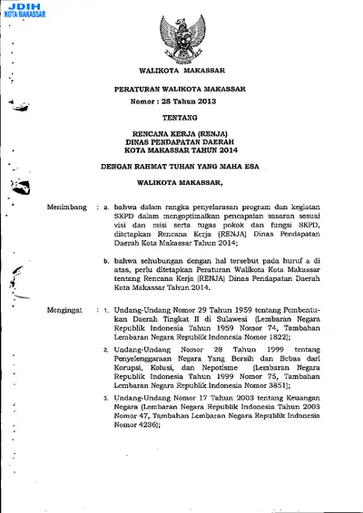 Peraturan Walikota Makassar Nomor 28 Tahun 2013 Tentang Rencana Kerja (RENJA) Dinas Pendapatan Daerah Kota Makassar Tahun 2014