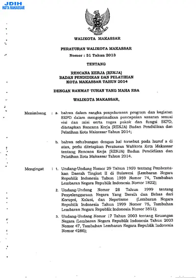 Peraturan Walikota Makassar Nomor 31 Tahun 2013 Tentang Rencana Kerja (RENJA) Badan Pendidikan Dan Pelatihan Kota Makassar Tahun 2014