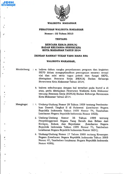 Peraturan Walikota Makassar Nomor 32 Tahun 2013 Tentang Rencana Kerja (RENJA) Badan Keluarga Berencana Kota Makassar Tahun 2014
