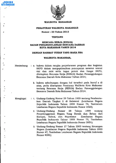 Peraturan Walikota Makassar Nomor 33 Tahun 2013 Tentang Rencana Kerja (RENJA) Badan Penanggulangan Bencana Daerah Kota Makassar 2014