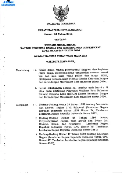 Peraturan Walikota Makassar Nomor 34 Tahun 2013 Tentang Rencana Kerja (RENJA) Kantor Kesatuan Bangsa Dan Perlindungan Masyarakat Kota Makassar Tahun .............
