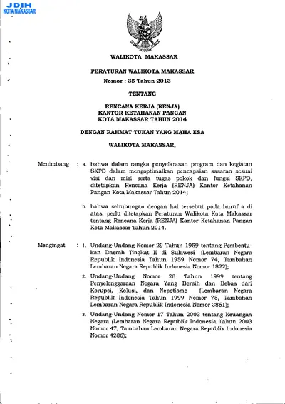 Peraturan Walikota Makassar Nomor 35 Tahun 2013 Tentang Rencana Kerja (RENJA) Kantor Ketahanan Pangan Kota Makassar 2014