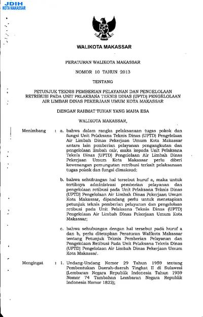 Peraturan Walikota Makassar Nomor 10 Tahun 2013 Tentang Petunjuk Teknis Pemberian Pelayanan Dan Pengelolaan Retribusi Pada Unit Pelaksana Teknis .............