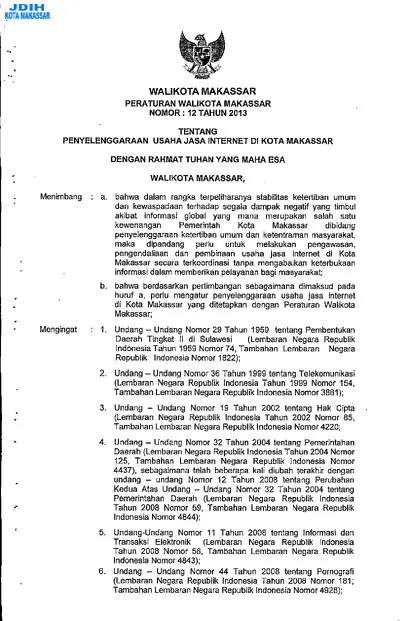 Peraturan Walikota Makassar Nomor 12 Tahun 2013 Tentang Penyelenggaraan Usaha Jasa Internet Di Kota Makassar