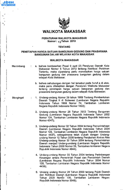 Peraturan Walikota Makassar Nomor 13 Tahun 2013 Tentang Penetapan Harga Satuan Bangunan Gedung Dan Prasarana Bangunan Dalam Wilayah Kota Makassar