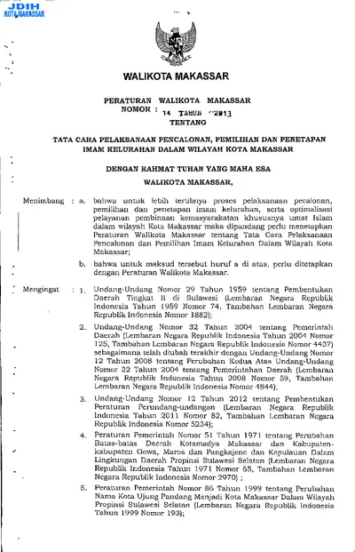 Peraturan Walikota Makassar Nomor 14 Tahun 2013 Tentang Tata Cara Pelaksanaan Pencalonan, Pemilihan Dan Penetapan Imam Kelurahan Dalam Wilayah Kota .............