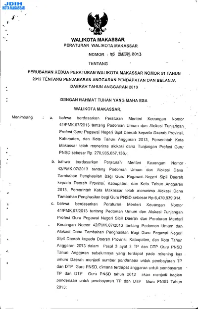 Peraturan Walikota Makassar Nomor 15 Tahun 2013 Tentang Perubahan Kedua Atas Peraturan Walikota Nomor 51 Tahun 2012 Tentang Penjabaran Anggaran .............