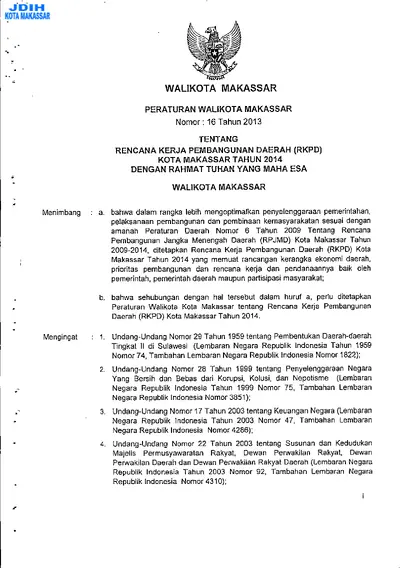 Peraturan Walikota Makassar Nomor 16 Tahun 2013 Tentang Rencana Kerja Pembangunan Daerah (UPTD) Kota Makassar Tahun 2014