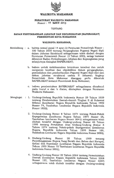 Peraturan Walikota Makassar Nomor 17 Tahun 2013 Tentang Badan Pertimbangan Jabatan Dan Kepangkatan (BAPERJAKAT) Pemerintah Kota Makassar