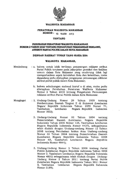 Peraturan Walikota Makassar Nomor 18 Tahun 2013 Tentang Perubahan Peraturan Walikota Makassar Nomor 2 Tahun 2010 Tentang Pengaturan Pemasangan .............