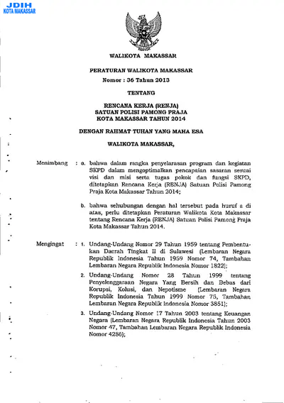 Peraturan Walikota Makassar Nomor 36 Tahun 2013 Tentang Rencana Kerja (RENJA) Satuan Polisi Pamong Praja Kota Makassar Tahun 2014