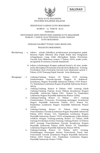 Peraturan Daerah Kota Makassar Nomor 2 Tahun 2012 Tentang Perubahan Atas Peraturan Daerah Kota Makassar Nomor 3 Tahun 2010 Tentang Pajak Daerah Kota .............