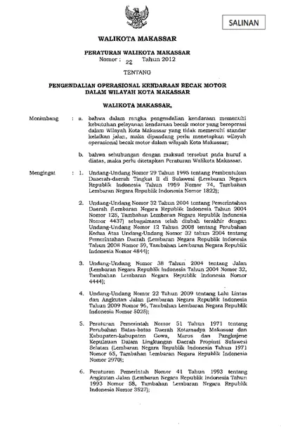 Peraturan Walikota Makassar Nomor 22 Tahun 2012 Tentang Pengendalian Operasional Kendaraan Becak Motor Dalam Wilayah Kota Makassar