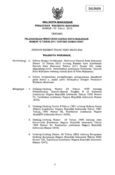 Peraturan Walikota Makassar Nomor 23 Tahun 2012 Tentang Pelaksanaan Peraturan Daerah Kota Makassar Nomor 10 Tahun 2011 Tentang Rumah Kost